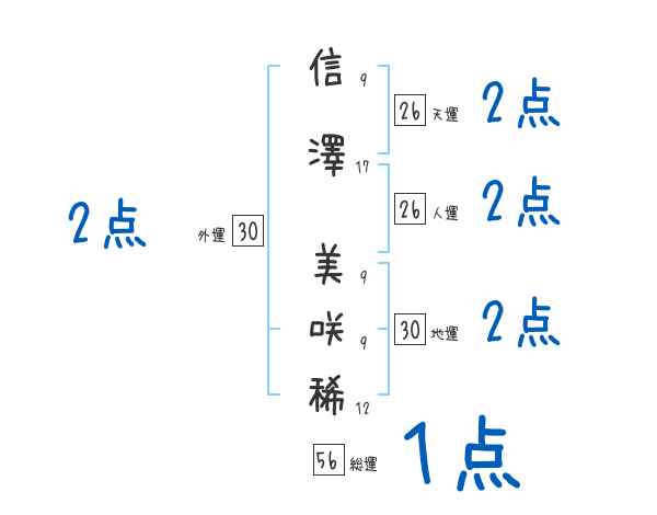 総運![]() | 信澤美咲稀さんの総運は56画の1つ星!消極的で無気力になりがち。誠実な気持ちが必要でしょう。 あなたの人生を表す1番重要な運勢です。生涯を通じて影響する総合運となり、主に50歳以降の晩年期に影響を及ぼします。 |