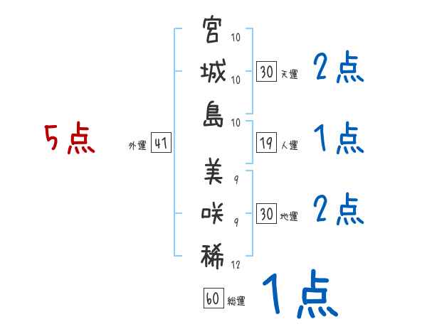 天運![]() | 宮城島美咲稀さんの天運は30画の2つ星!浮き沈みの激しさに注意しましょう。 家系が持つ宿命的な運勢を表します。祖先から受け継いだ苗字ですので自分の力が及びません。家柄を象徴します。 |