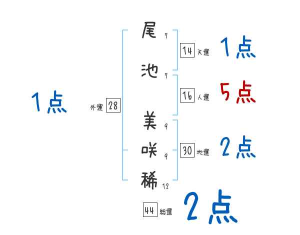 天運![]() | 尾池美咲稀さんの天運は14画の1つ星!人に対して優しいがストレスを溜め込みがち。人間関係のトラブルを避けるよう気をつけましょう。 家系が持つ宿命的な運勢を表します。祖先から受け継いだ苗字ですので自分の力が及びません。家柄を象徴します。 |