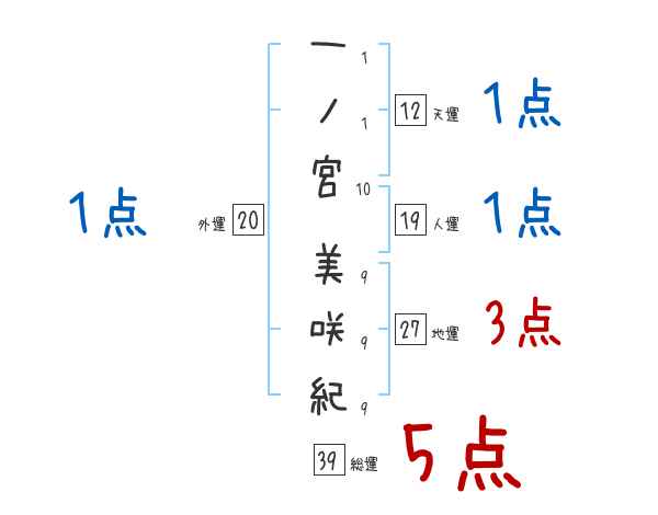 総運![]() | 一ノ宮美咲紀さんの総運は39画の5つ星!社交性に優れ人望が厚い。人の上に立ち成功する。 あなたの人生を表す1番重要な運勢です。生涯を通じて影響する総合運となり、主に50歳以降の晩年期に影響を及ぼします。 |