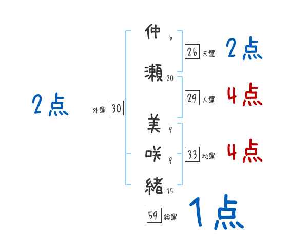 外運![]() | 仲瀬美咲緒さんの外運は30画の2つ星!浮き沈みの激しさに注意しましょう。 生活面を象徴する運勢です。外部から受ける影響力を表し、結婚運、家庭運や職場、環境への順応性を表します。 |