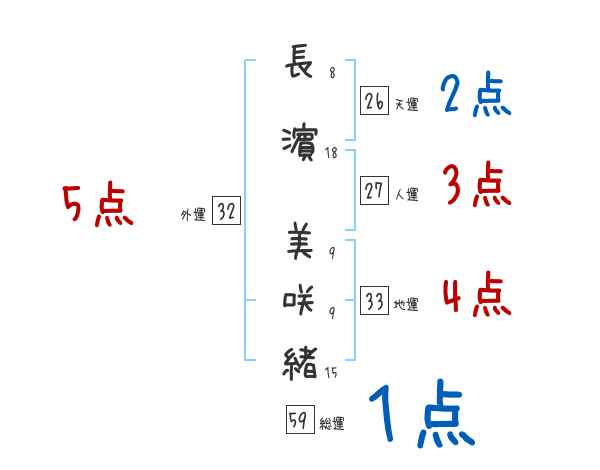 外運![]() | 長濵美咲緒さんの外運は32画の5つ星!柔軟性があり成功する。チャンスが多く金運が良い。 生活面を象徴する運勢です。外部から受ける影響力を表し、結婚運、家庭運や職場、環境への順応性を表します。 |