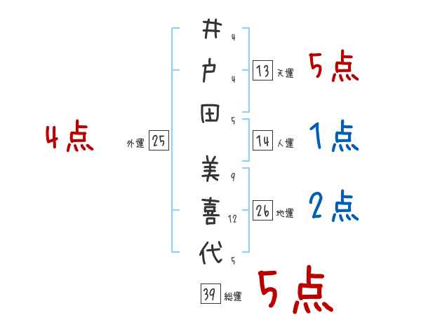 総運![]() | 井戸田美喜代さんの総運は39画の5つ星!社交性に優れ人望が厚い。人の上に立ち成功する。 あなたの人生を表す1番重要な運勢です。生涯を通じて影響する総合運となり、主に50歳以降の晩年期に影響を及ぼします。 |