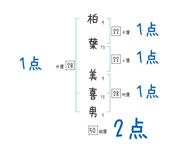天運![]() | 柏葉美喜男さんの天運は22画の1つ星!努力することが苦手ないっぽう手先が器用。芸術性にも優れる。 家系が持つ宿命的な運勢を表します。祖先から受け継いだ苗字ですので自分の力が及びません。家柄を象徴します。 |