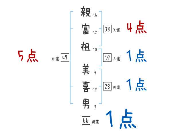 外運![]() | 親富祖美喜男さんの外運は47画の5つ星!実力が開花し発展する円満な人生。財に恵まれる。 生活面を象徴する運勢です。外部から受ける影響力を表し、結婚運、家庭運や職場、環境への順応性を表します。 |