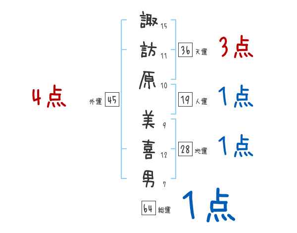 天運![]() | 諏訪原美喜男さんの天運は36画の3つ星!先見性が豊かです。多少神経質で苦労することも。 家系が持つ宿命的な運勢を表します。祖先から受け継いだ苗字ですので自分の力が及びません。家柄を象徴します。 |