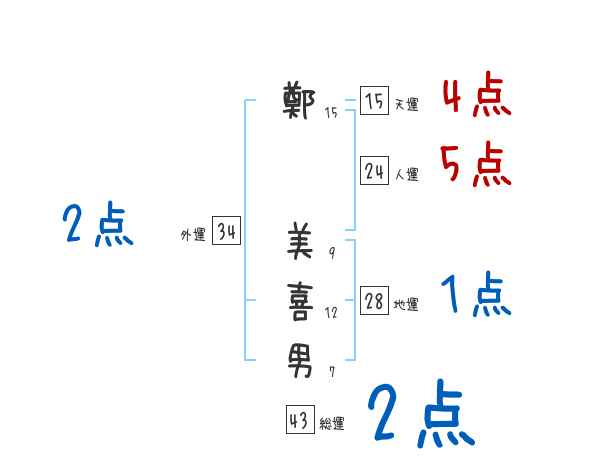 外運![]() | 鄭美喜男さんの外運は34画の2つ星!独創性に優れるが、自尊心が強く災難に注意しましょう。 生活面を象徴する運勢です。外部から受ける影響力を表し、結婚運、家庭運や職場、環境への順応性を表します。 |