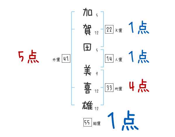 外運![]() | 加賀田美喜雄さんの外運は41画の5つ星!大志を抱き、目標に向かって実力を発揮し達成する。温和な性格。 生活面を象徴する運勢です。外部から受ける影響力を表し、結婚運、家庭運や職場、環境への順応性を表します。 |