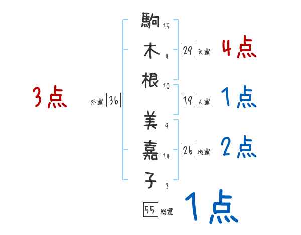 外運![]() | 駒木根美嘉子さんの外運は36画の3つ星!先見性が豊かです。多少神経質で苦労することも。 生活面を象徴する運勢です。外部から受ける影響力を表し、結婚運、家庭運や職場、環境への順応性を表します。 |