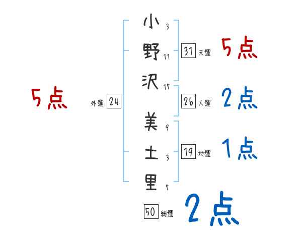 総運![]() | 小野沢美土里さんの総運は50画の2つ星!浮き沈みが激しく不安定。しりすぼみに衰退しやすいので注意しましょう。 あなたの人生を表す1番重要な運勢です。生涯を通じて影響する総合運となり、主に50歳以降の晩年期に影響を及ぼします。 |