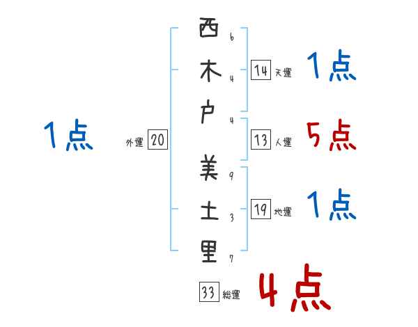 天運![]() | 西木戸美土里さんの天運は14画の1つ星!人に対して優しいがストレスを溜め込みがち。人間関係のトラブルを避けるよう気をつけましょう。 家系が持つ宿命的な運勢を表します。祖先から受け継いだ苗字ですので自分の力が及びません。家柄を象徴します。 |