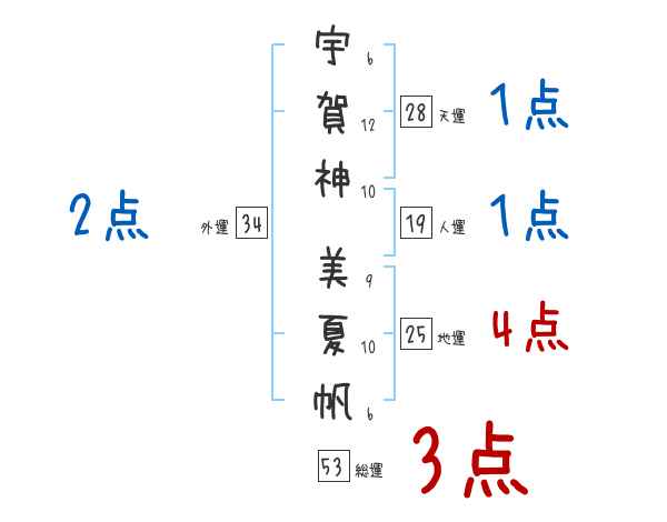 外運![]() | 宇賀神美夏帆さんの外運は34画の2つ星!独創性に優れるが、自尊心が強く災難に注意しましょう。 生活面を象徴する運勢です。外部から受ける影響力を表し、結婚運、家庭運や職場、環境への順応性を表します。 |
