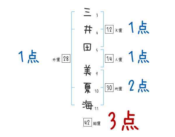 外運![]() | 三井田美夏海さんの外運は28画の1つ星!家庭環境に注意。スポーツで活躍できる能力があるかも。 生活面を象徴する運勢です。外部から受ける影響力を表し、結婚運、家庭運や職場、環境への順応性を表します。 |