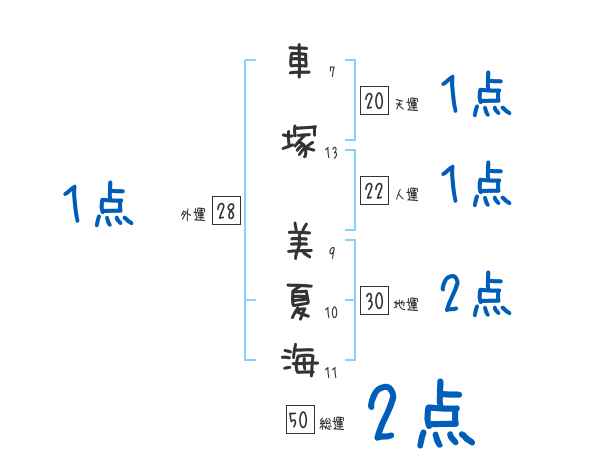 外運![]() | 車塚美夏海さんの外運は28画の1つ星!家庭環境に注意。スポーツで活躍できる能力があるかも。 生活面を象徴する運勢です。外部から受ける影響力を表し、結婚運、家庭運や職場、環境への順応性を表します。 |