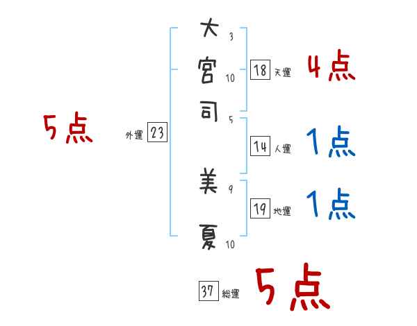 総運![]() | 大宮司美夏さんの総運は37画の5つ星!努力家で順応性に優れる。現実的な考え方ができ忠実に物事をこなす。 あなたの人生を表す1番重要な運勢です。生涯を通じて影響する総合運となり、主に50歳以降の晩年期に影響を及ぼします。 |