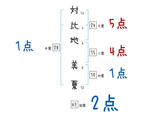 外運![]() | 対比地美夏さんの外運は28画の1つ星!家庭環境に注意。スポーツで活躍できる能力があるかも。 生活面を象徴する運勢です。外部から受ける影響力を表し、結婚運、家庭運や職場、環境への順応性を表します。 |