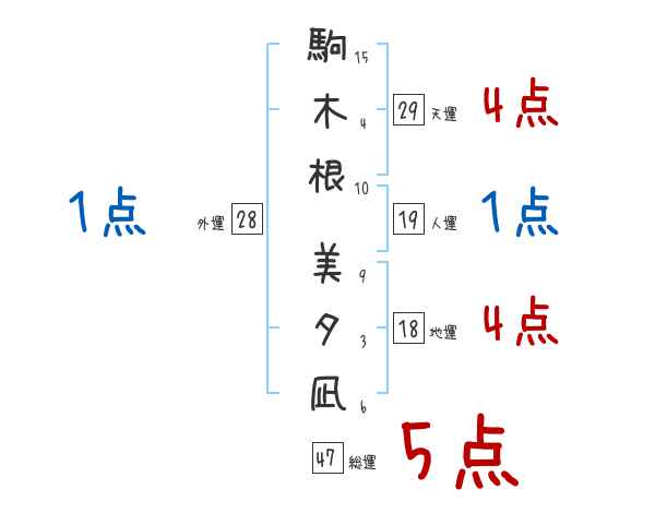 総運![]() | 駒木根美夕凪さんの総運は47画の5つ星!実力が開花し発展する円満な人生。財に恵まれる。 あなたの人生を表す1番重要な運勢です。生涯を通じて影響する総合運となり、主に50歳以降の晩年期に影響を及ぼします。 |