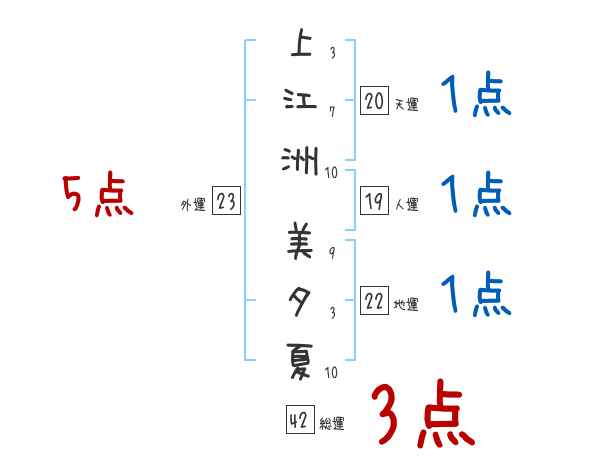 外運![]() | 上江洲美夕夏さんの外運は23画の5つ星!想像力に優れ活力がある。一代で成功し名誉を手に入れる。 生活面を象徴する運勢です。外部から受ける影響力を表し、結婚運、家庭運や職場、環境への順応性を表します。 |
