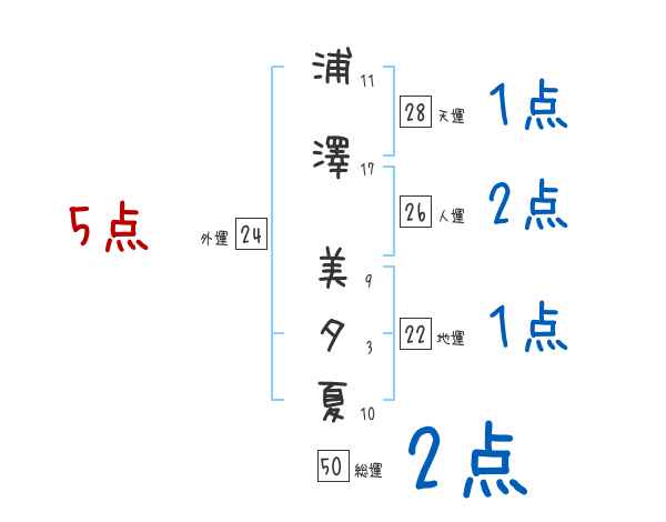外運![]() | 浦澤美夕夏さんの外運は24画の5つ星!家庭運が良く順調な人生。金運にも恵まれる。 生活面を象徴する運勢です。外部から受ける影響力を表し、結婚運、家庭運や職場、環境への順応性を表します。 |