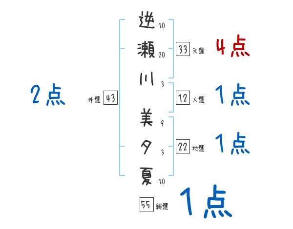 天運![]() | 逆瀬川美夕夏さんの天運は33画の4つ星!権力志向でプライドが高い。勇気があり運を切り開き成功する。 家系が持つ宿命的な運勢を表します。祖先から受け継いだ苗字ですので自分の力が及びません。家柄を象徴します。 |