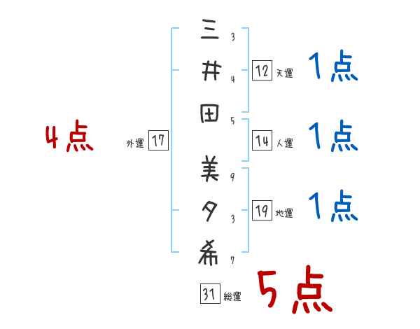 外運![]() | 三井田美夕希さんの外運は17画の4つ星!積極的な行動力。地位を気づき財産を手に入れる。純粋な心と直感力。 生活面を象徴する運勢です。外部から受ける影響力を表し、結婚運、家庭運や職場、環境への順応性を表します。 |