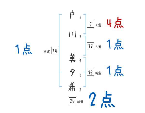 外運![]() | 戸川美夕希さんの外運は14画の1つ星!人に対して優しいがストレスを溜め込みがち。人間関係のトラブルを避けるよう気をつけましょう。 生活面を象徴する運勢です。外部から受ける影響力を表し、結婚運、家庭運や職場、環境への順応性を表します。 |