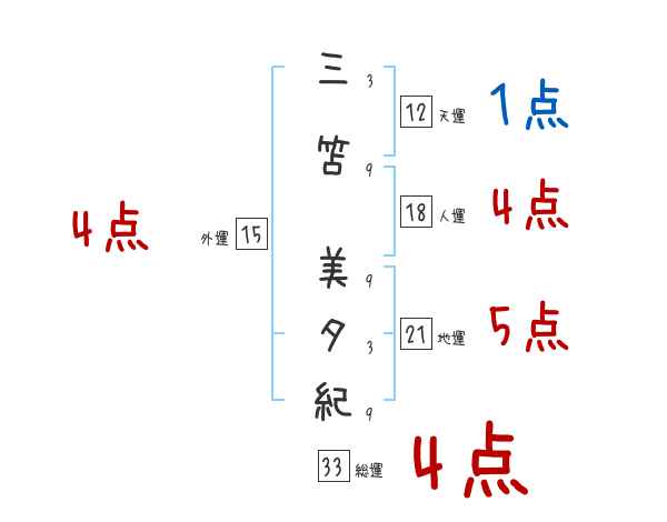 天運![]() | 三笘美夕紀さんの天運は12画の1つ星!簡単な失敗で諦めてしまいやすいかも。着実に行動すると良いでしょう。 家系が持つ宿命的な運勢を表します。祖先から受け継いだ苗字ですので自分の力が及びません。家柄を象徴します。 |
