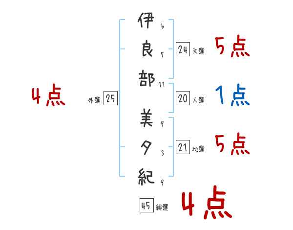 総運![]() | 伊良部美夕紀さんの総運は45画の4つ星!もくもくと物事を進め達成する。地味な努力家。 あなたの人生を表す1番重要な運勢です。生涯を通じて影響する総合運となり、主に50歳以降の晩年期に影響を及ぼします。 |