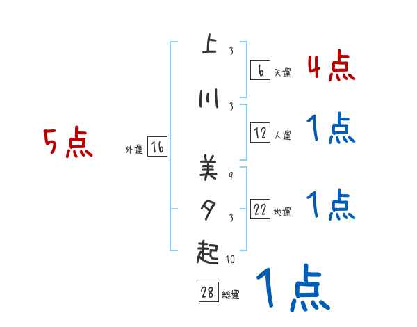 | 地運  | 上川美夕起さんの地運は22画の1つ星!努力することが苦手ないっぽう手先が器用。芸術性にも優れる。個性を表す基礎的な運勢です。性格形成や対人関係、行動力など家庭環境に影響されます。主に誕生してから20歳くらいまでの若年期の運勢を表します。 |