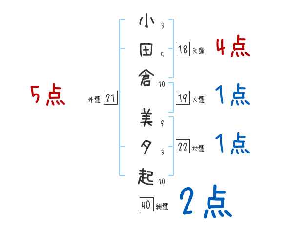 外運![]() | 小田倉美夕起さんの外運は21画の5つ星!統率力がある。独立し成功する。名誉を手に入れる。 生活面を象徴する運勢です。外部から受ける影響力を表し、結婚運、家庭運や職場、環境への順応性を表します。 |