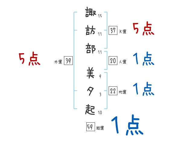 総運![]() | 諏訪部美夕起さんの総運は59画の1つ星!意志の弱さであきらめることが多いかも。粘り強さが必要。 あなたの人生を表す1番重要な運勢です。生涯を通じて影響する総合運となり、主に50歳以降の晩年期に影響を及ぼします。 |