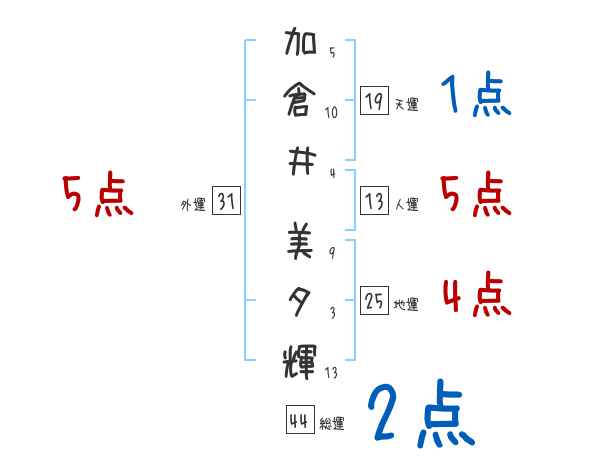 総運![]() | 加倉井美夕輝さんの総運は44画の2つ星!誠実で慎重な性格。物事を考えすぎないように注意しましょう。 あなたの人生を表す1番重要な運勢です。生涯を通じて影響する総合運となり、主に50歳以降の晩年期に影響を及ぼします。 |