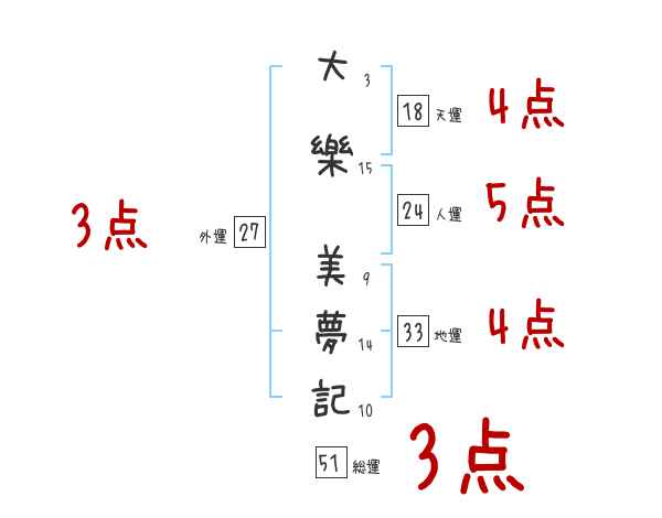 総運![]() | 大樂美夢記さんの総運は51画の3つ星!変化が激しく、危険に注意。堅実な性格。 あなたの人生を表す1番重要な運勢です。生涯を通じて影響する総合運となり、主に50歳以降の晩年期に影響を及ぼします。 |