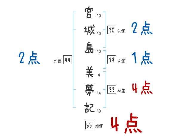 総運![]() | 宮城島美夢記さんの総運は63画の4つ星!家庭運がよく順調な生活。温和な性格。 あなたの人生を表す1番重要な運勢です。生涯を通じて影響する総合運となり、主に50歳以降の晩年期に影響を及ぼします。 |