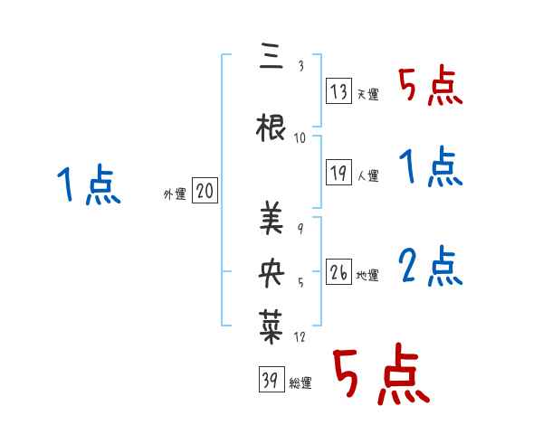 天運![]()  | 三根美央菜さんの天運は13画の5つ星!才能に恵まれ人気がある。名声を手に入れる。円満な人生。 家系が持つ宿命的な運勢を表します。祖先から受け継いだ苗字ですので自分の力が及びません。家柄を象徴します。 |