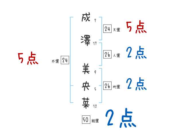 外運![]() | 成澤美央菜さんの外運は24画の5つ星!家庭運が良く順調な人生。金運にも恵まれる。 生活面を象徴する運勢です。外部から受ける影響力を表し、結婚運、家庭運や職場、環境への順応性を表します。 |