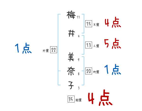 総運![]() | 梅井美奈子さんの総運は35画の4つ星!温厚な性格で感受性が高い。穏和な性格で人望が厚い。 あなたの人生を表す1番重要な運勢です。生涯を通じて影響する総合運となり、主に50歳以降の晩年期に影響を及ぼします。 |