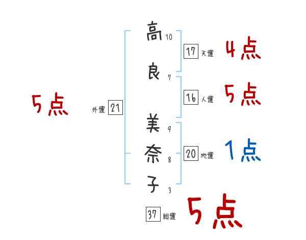 人運![]() | 高良美奈子さんの人運は16画の5つ星!人望が厚く大きく発展する。逆転成功が見える。 性格や才能などを表す2番目に重要な運勢です。人間関係や協調性、社会的な成功に影響します。主に20歳から50歳ぐらいまでの中年期の運勢を表します。 |