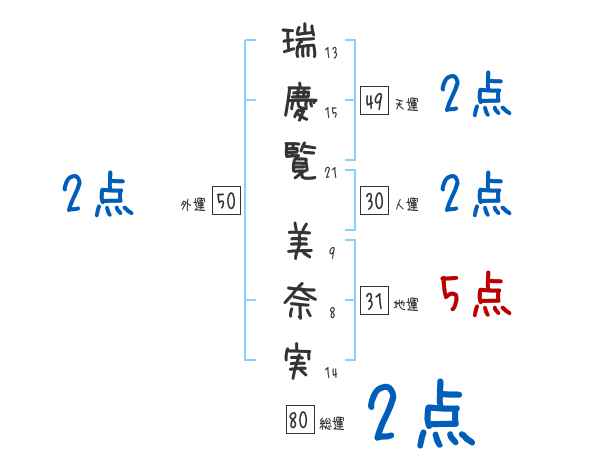 天運![]() | 瑞慶覧美奈実さんの天運は49画の2つ星!不安定な性格で明暗がある人生。周りの人には支援されやすい。 家系が持つ宿命的な運勢を表します。祖先から受け継いだ苗字ですので自分の力が及びません。家柄を象徴します。 |