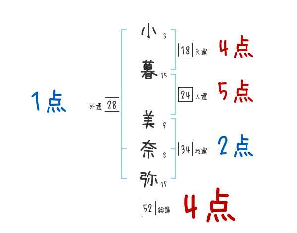 外運![]() | 小暮美奈弥さんの外運は28画の1つ星!家庭環境に注意。スポーツで活躍できる能力があるかも。 生活面を象徴する運勢です。外部から受ける影響力を表し、結婚運、家庭運や職場、環境への順応性を表します。 |