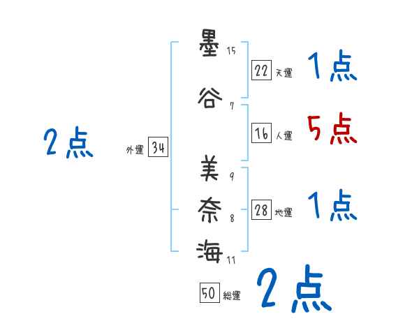 人運![]() | 墨谷美奈海さんの人運は16画の5つ星!人望が厚く大きく発展する。逆転成功が見える。 性格や才能などを表す2番目に重要な運勢です。人間関係や協調性、社会的な成功に影響します。主に20歳から50歳ぐらいまでの中年期の運勢を表します。 |