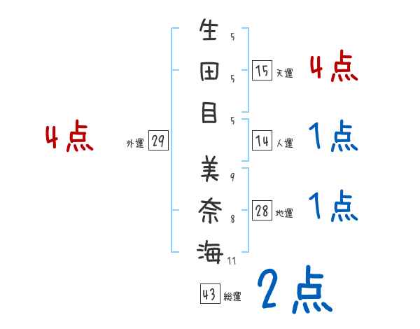 総運![]() | 生田目美奈海さんの総運は43画の2つ星!頑固な性格で独立心が強いかも。やや非現実的で浪費に注意しましょう。 あなたの人生を表す1番重要な運勢です。生涯を通じて影響する総合運となり、主に50歳以降の晩年期に影響を及ぼします。 |