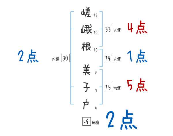 天運![]() | 嵯峨根美子戸さんの天運は33画の4つ星!権力志向でプライドが高い。勇気があり運を切り開き成功する。 家系が持つ宿命的な運勢を表します。祖先から受け継いだ苗字ですので自分の力が及びません。家柄を象徴します。 |