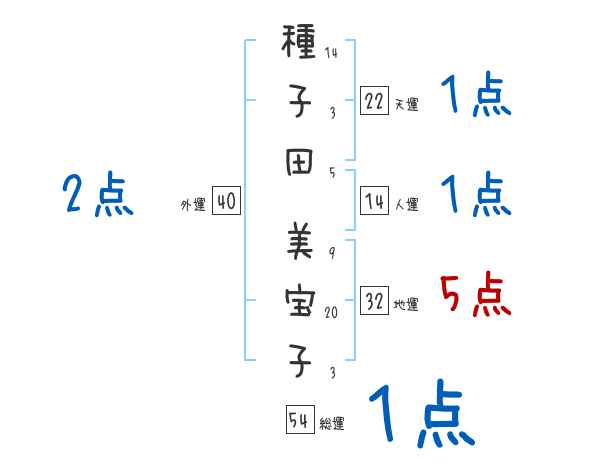 外運![]() | 種子田美宝子さんの外運は40画の2つ星!自信過剰で物事に固執するためトラブルに注意。 生活面を象徴する運勢です。外部から受ける影響力を表し、結婚運、家庭運や職場、環境への順応性を表します。 |