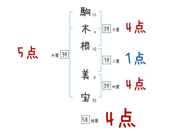 外運![]() | 駒木根美宝さんの外運は39画の5つ星!社交性に優れ人望が厚い。人の上に立ち成功する。 生活面を象徴する運勢です。外部から受ける影響力を表し、結婚運、家庭運や職場、環境への順応性を表します。 |