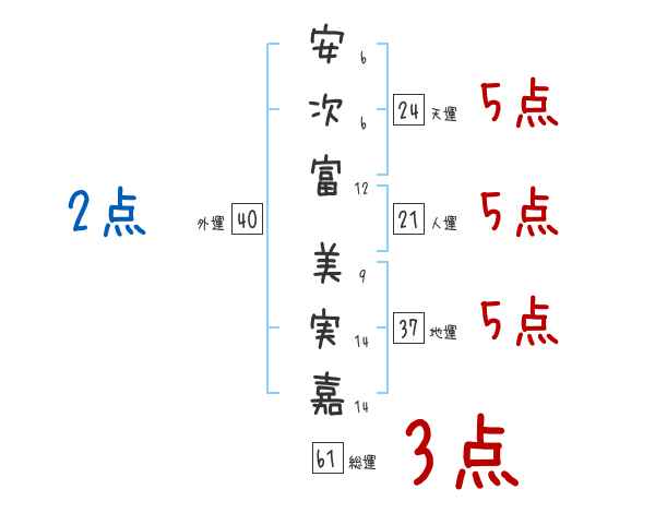 天運![]() | 安次富美実嘉さんの天運は24画の5つ星!家庭運が良く順調な人生。金運にも恵まれる。 家系が持つ宿命的な運勢を表します。祖先から受け継いだ苗字ですので自分の力が及びません。家柄を象徴します。 |