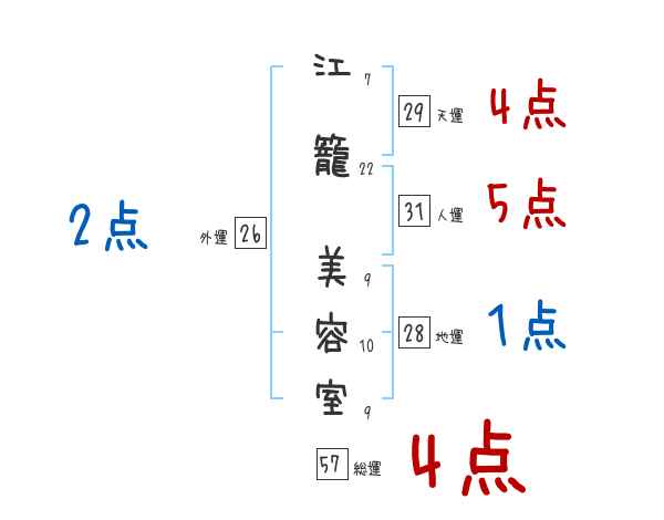総運![]() | 江籠美容室さんの総運は57画の4つ星!向上心があり人望がある。地位を得る。 あなたの人生を表す1番重要な運勢です。生涯を通じて影響する総合運となり、主に50歳以降の晩年期に影響を及ぼします。 |