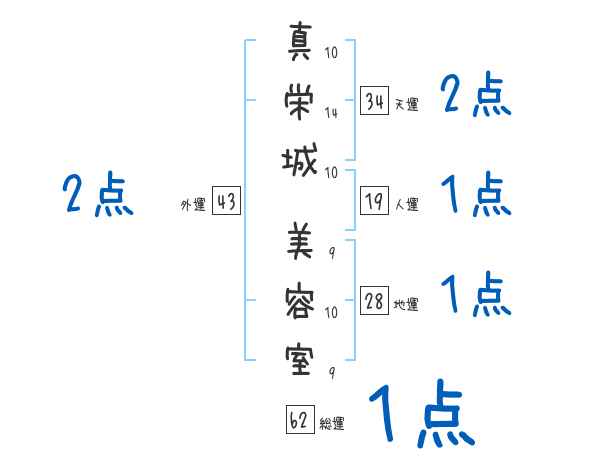 天運![]() | 真栄城美容室さんの天運は34画の2つ星!独創性に優れるが、自尊心が強く災難に注意しましょう。 家系が持つ宿命的な運勢を表します。祖先から受け継いだ苗字ですので自分の力が及びません。家柄を象徴します。 |