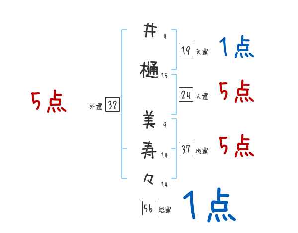 外運![]() | 井樋美寿々さんの外運は32画の5つ星!柔軟性があり成功する。チャンスが多く金運が良い。 生活面を象徴する運勢です。外部から受ける影響力を表し、結婚運、家庭運や職場、環境への順応性を表します。 |