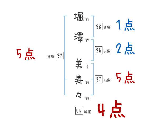 外運![]() | 堀澤美寿々さんの外運は39画の5つ星!社交性に優れ人望が厚い。人の上に立ち成功する。 生活面を象徴する運勢です。外部から受ける影響力を表し、結婚運、家庭運や職場、環境への順応性を表します。 |
